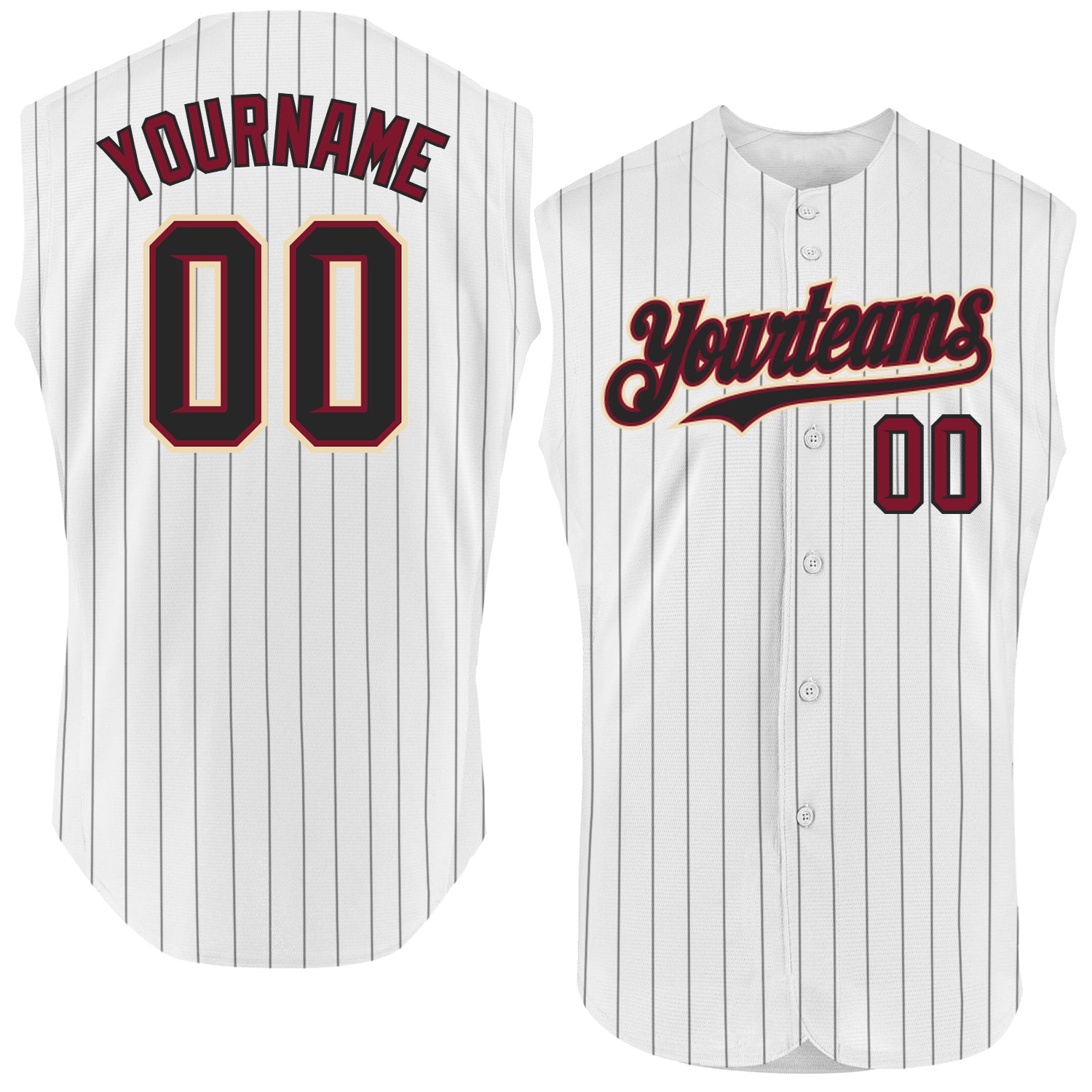 Customizable Crimson City Cream Baseball Jersey with Personalized Name and Number – Authentic Sleeveless Design in Black White Pinstripes
