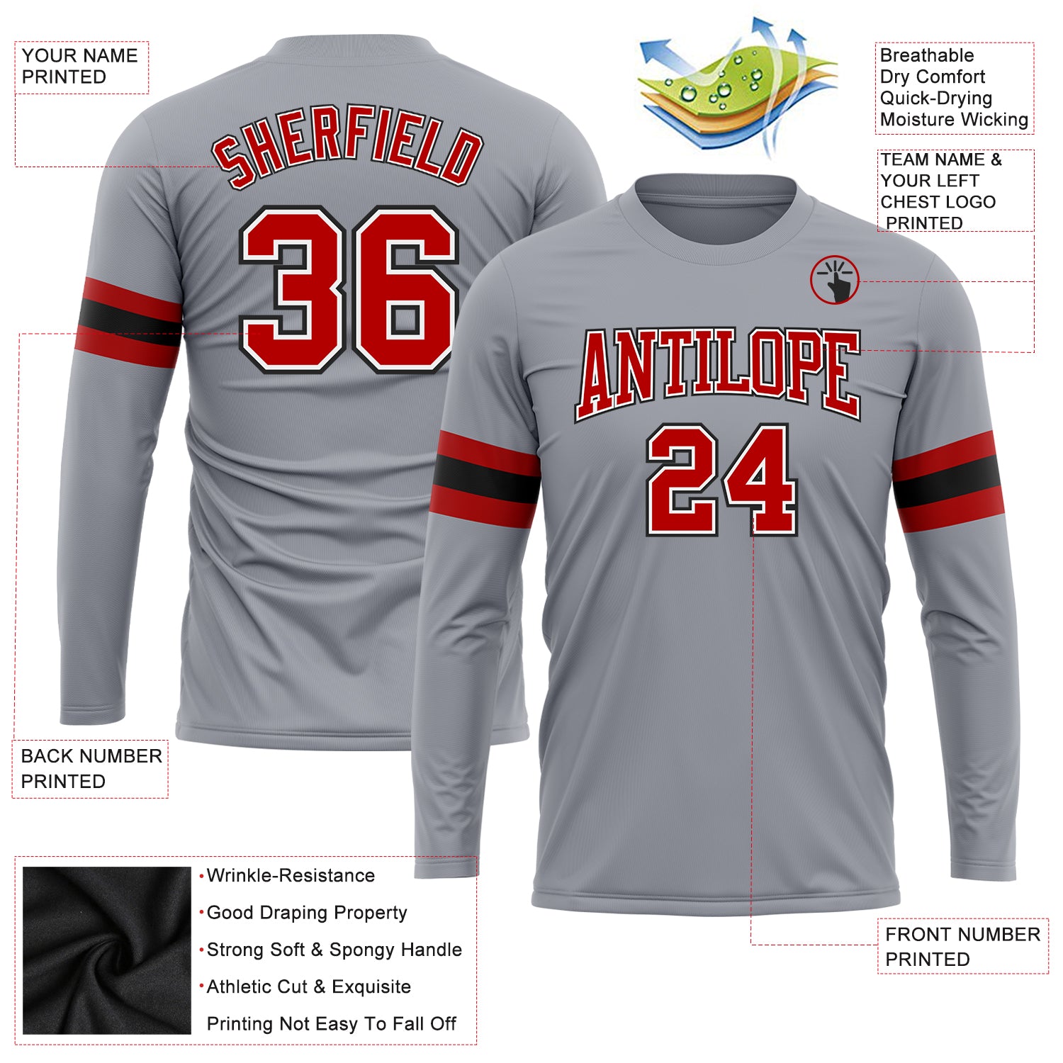 Custom Performance T-Shirt for Men – Gray with Red and Black Long Sleeves Custom Gray Red-Black Long Sleeve Performance T-Shirt