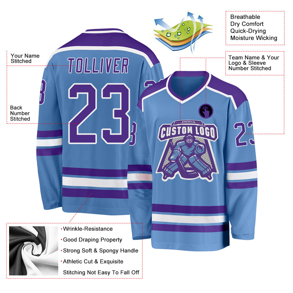 Custom Light Blue Purple White Hockey Jersey for Men and Women, Personalized Team Sports Apparel Custom Light Blue Purple-White