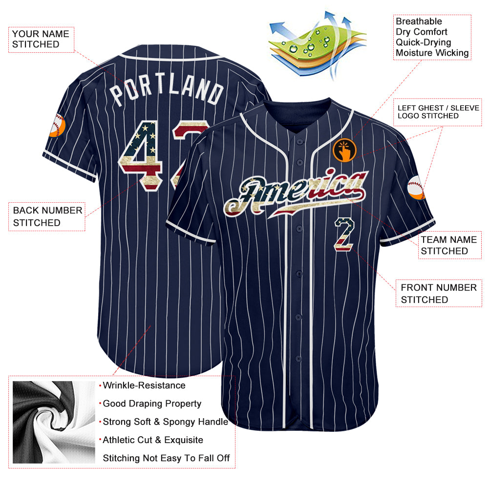 Custom Vintage USA Flag Baseball Jersey – Navy White Pinstripe Authentic Design Custom Navy White Pinstripe Vintage USA Flag-White