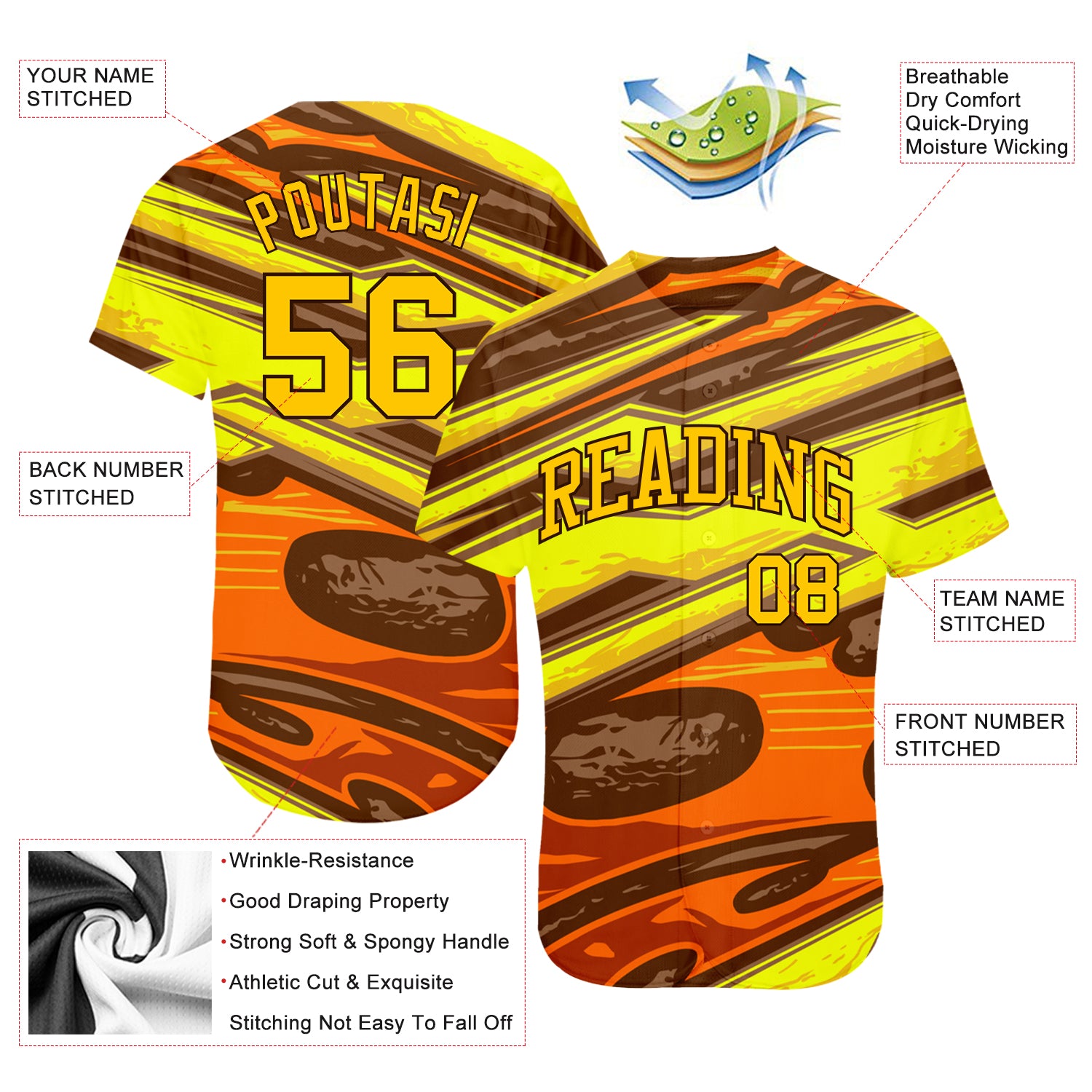 Our baseball jerseys are available in all sizes from XS to 7XL, ensuring that we cater to everyone's needs. We use stitched (embroidered) materials to create a high-quality finish, ensuring longevity and durability for your jersey.