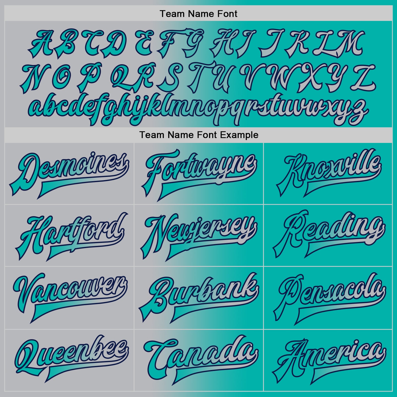 Custom Name and Number Aqua Gray-Navy Varsity Letterman Jacket Bomber Fashion Full-Snap Gradient Design Personalized Aqua