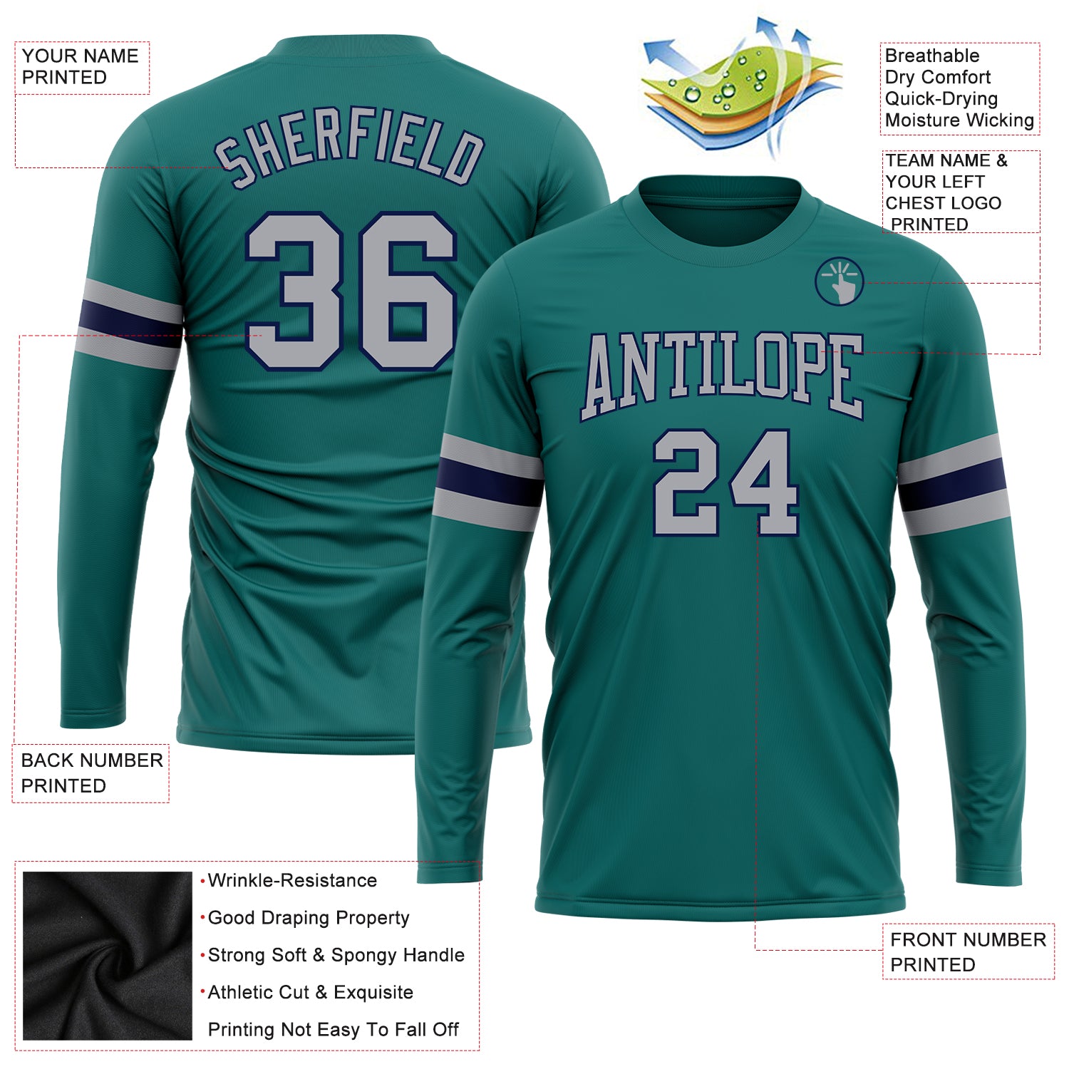 Custom Team Performance T-Shirt with Personalized Name & Number – Aqua Gray-Navy Long Sleeve Personalized Aqua Gray-Navy