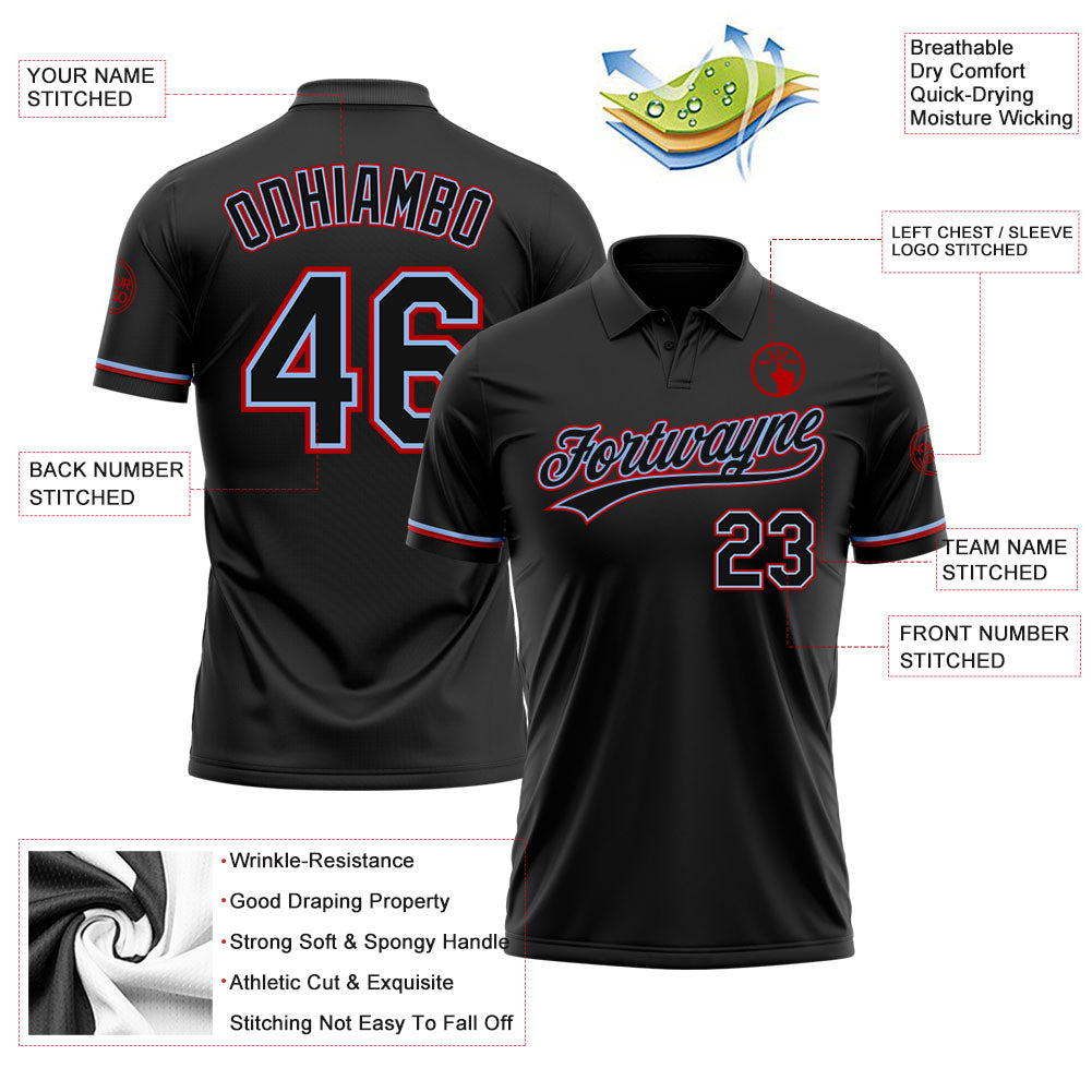 Personalized Black Light Blue-Red Performance Vapor Golf Polo Shirt for Men Personalized Black Black Light Blue-Red Performance