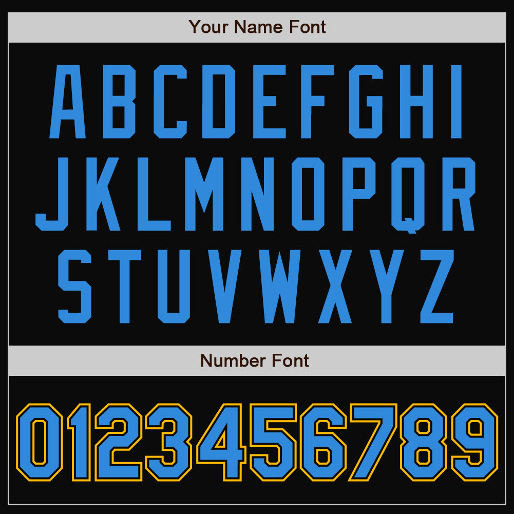 Personalized Black Electric Blue-Gold Bomber Full-Snap Varsity Letterman Two Tone Jacket Team Custom Name and Number