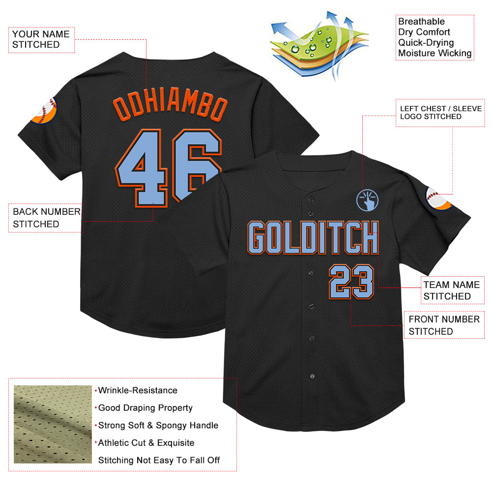 Personalized Black Light Blue Orange Baseball Jersey Throwback Mesh 2 Personalized Black Light Blue-Orange Mesh Throwback