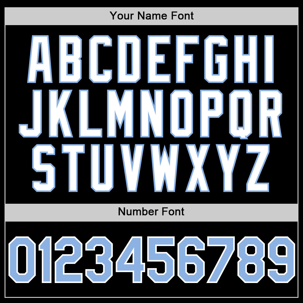 Custom Personalized Varsity Letterman Hoodie Jacket – Black Light Blue White Bomber with Team Name & Number Personalized