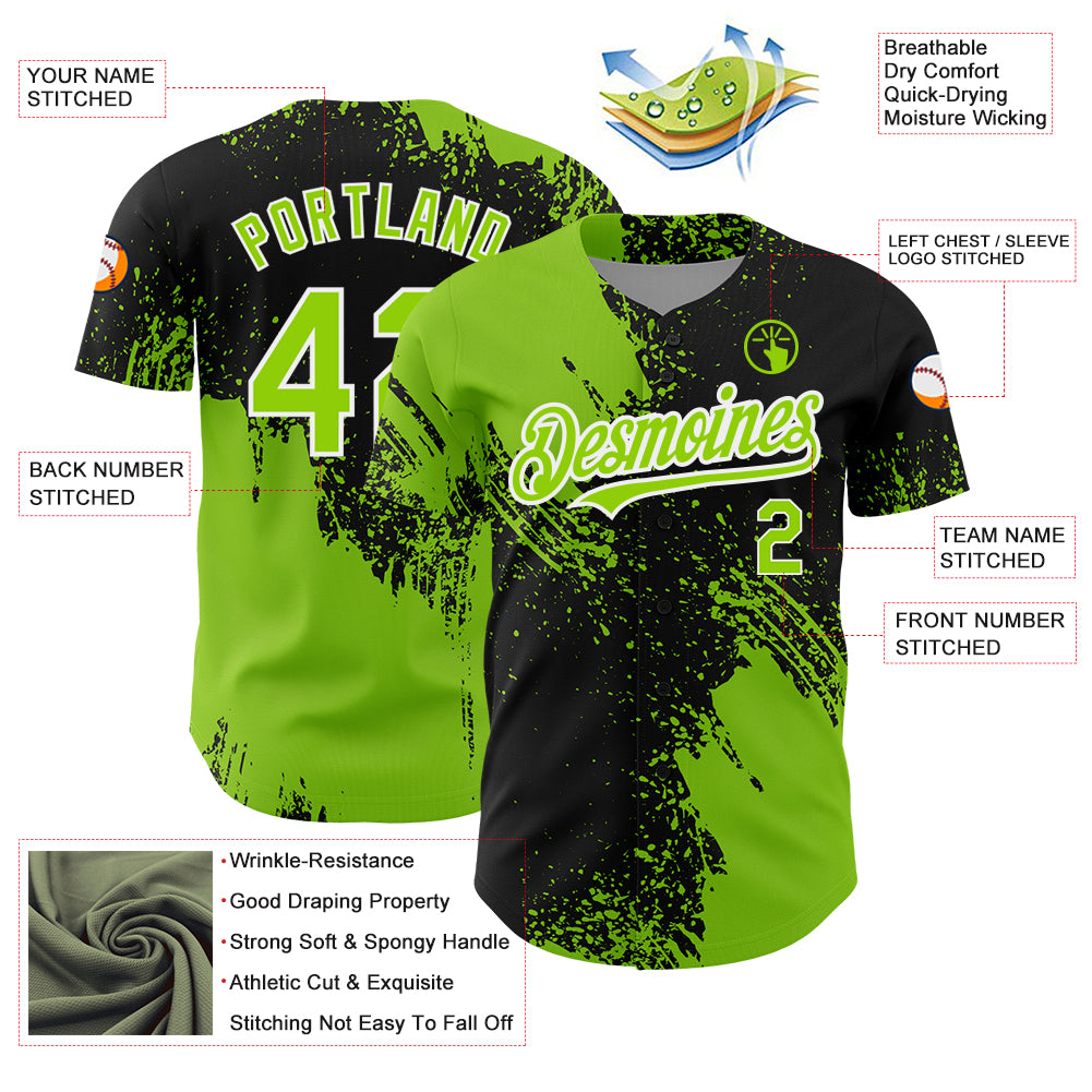 Personalized 3D Abstract Brush Stroke Baseball Jersey in Black Neon Green-White Personalized Black Neon Green-White 3D Abstract