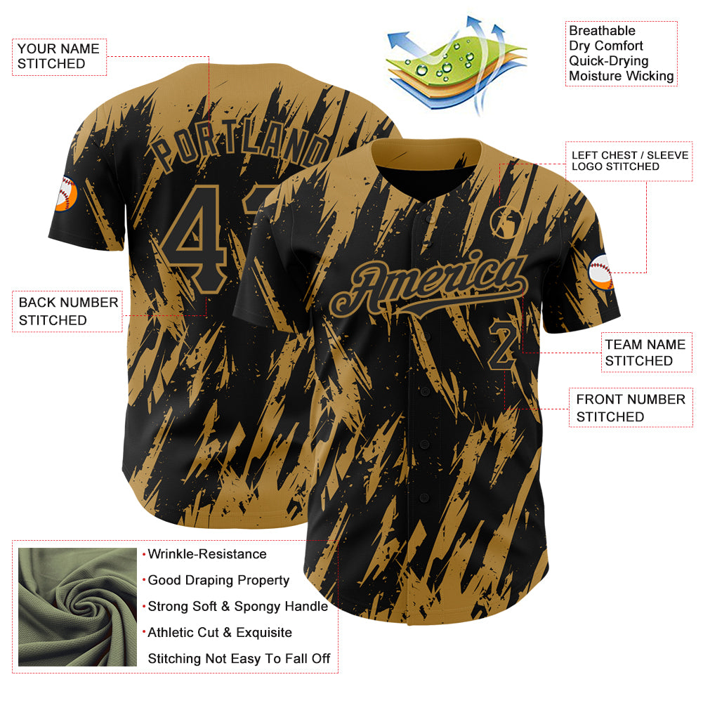 Personalized Black Old Gold 3D Pattern Design Abstract Sharp Shape Authentic Baseball Jersey Team Custom Name and Number