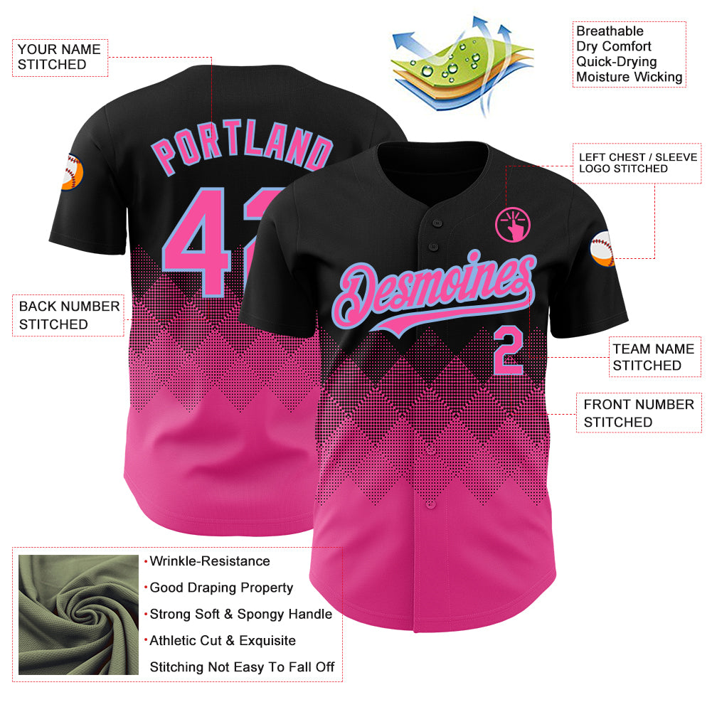 Personalized 3D Gradient Baseball Jersey | Black Pink-Light Blue Square Shapes Design Personalized Black Pink-Light Blue
