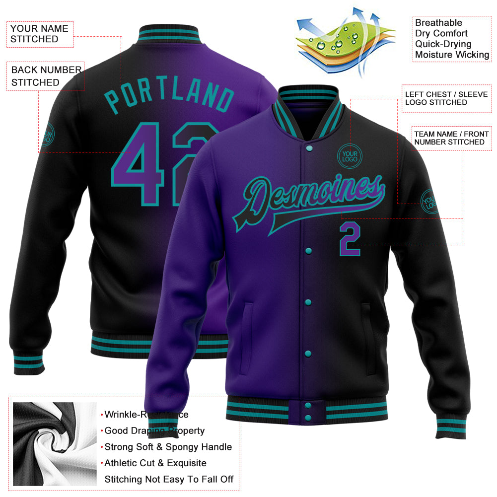 Personalized Black Purple-Teal Bomber Full-Snap Varsity Letterman Gradient Fashion Jacket