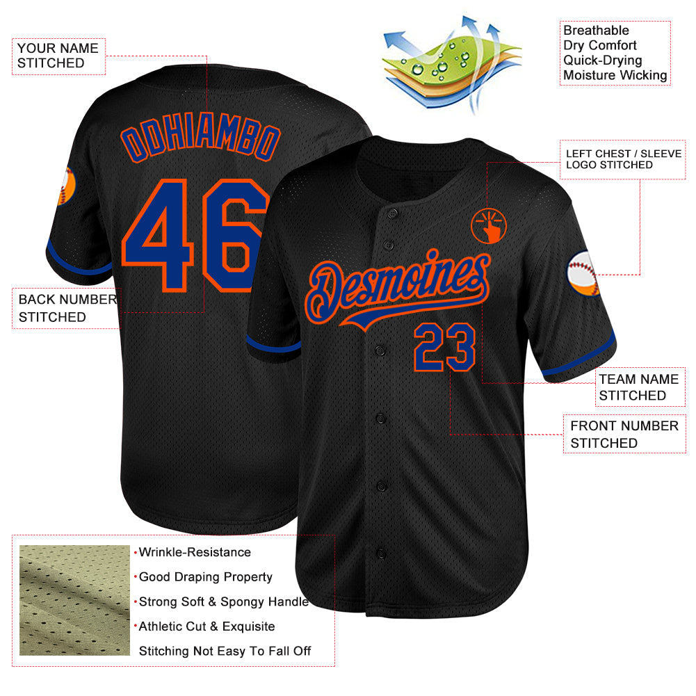 Personalized Black and Orange Mesh Baseball Jersey – Authentic Throwback Design Personalized Black Royal-Orange Mesh Authentic