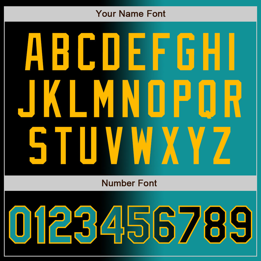 Custom Gradient Bomber Jacket with Name and Number – Teal Gold Full-Snap Varsity Letterman Fashion Jacket Personalized Black
