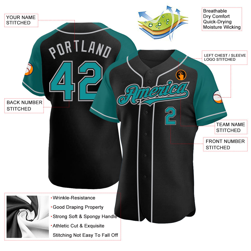 Personalized Black Teal-Gray Authentic Raglan Sleeves Baseball Jersey Team Custom Name and Number