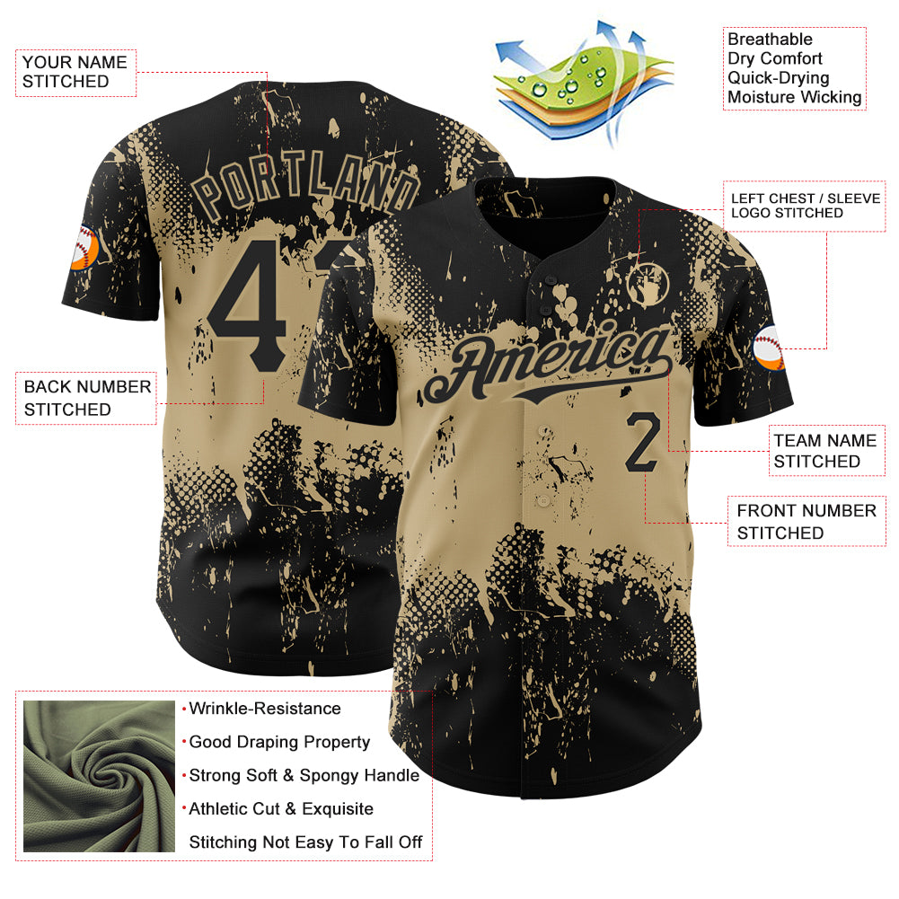 Personalized Black Gold 3D Abstract Splatter Grunge Art Baseball Jersey Personalized Black Vegas Gold 3D Abstract Splatter