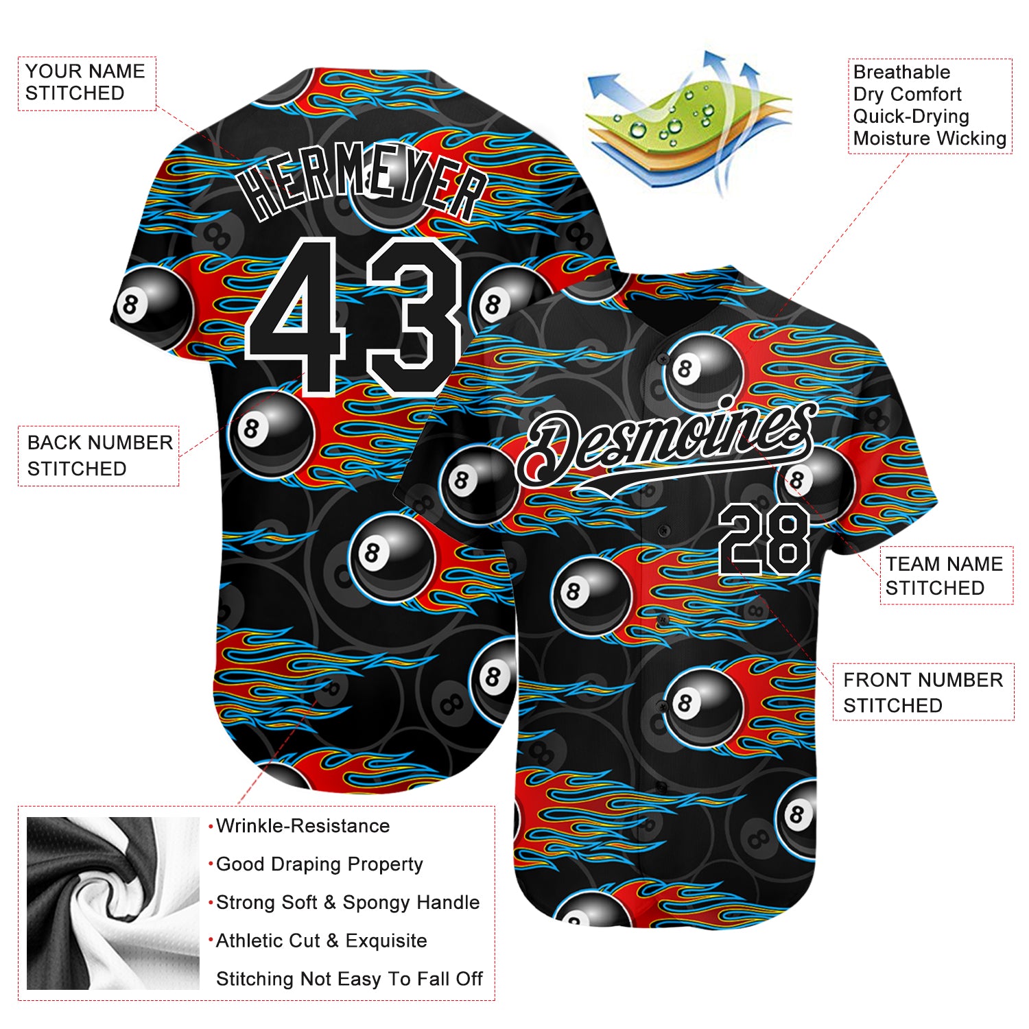 Personalized Black White 3D Pattern Design Flaming Billiards Snooker 8 Ball Authentic Baseball Jersey