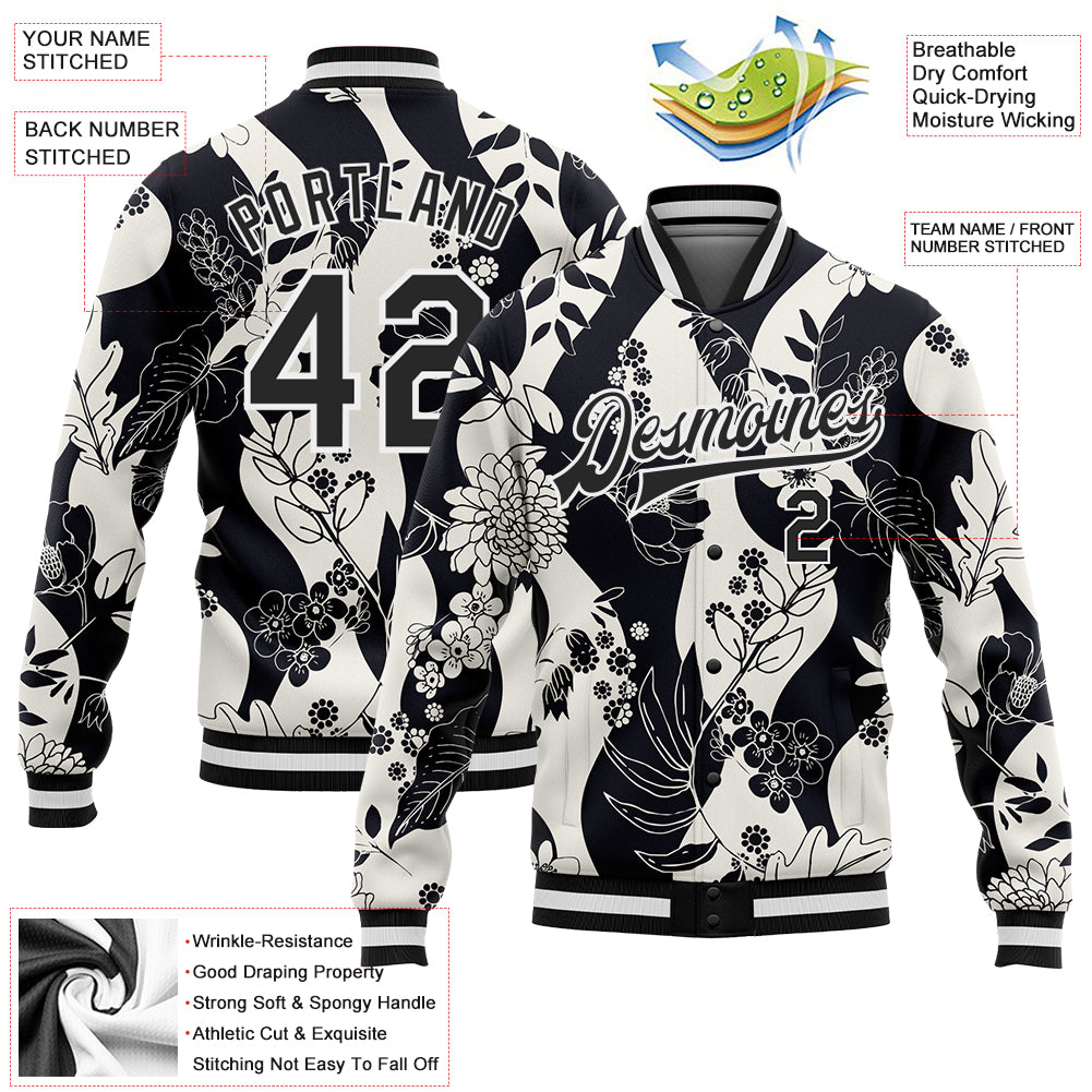 Personalized Black White Floral Wave 3D Bomber Full-Snap Varsity Letterman Jacket