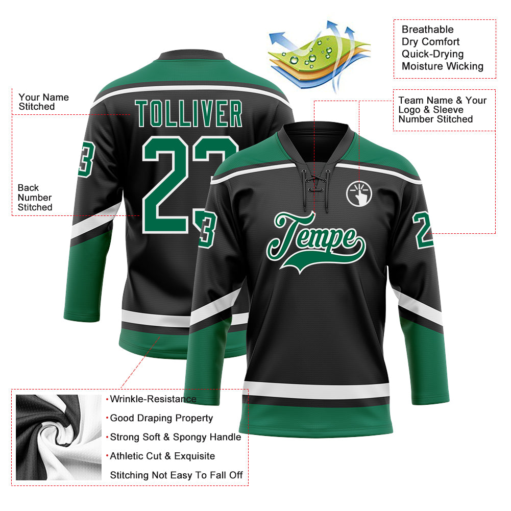 Custom Name Number Jersey – Personalized Black White Kelly Green Hockey Lace Neck Team Shirt Personalized Black White-Kelly