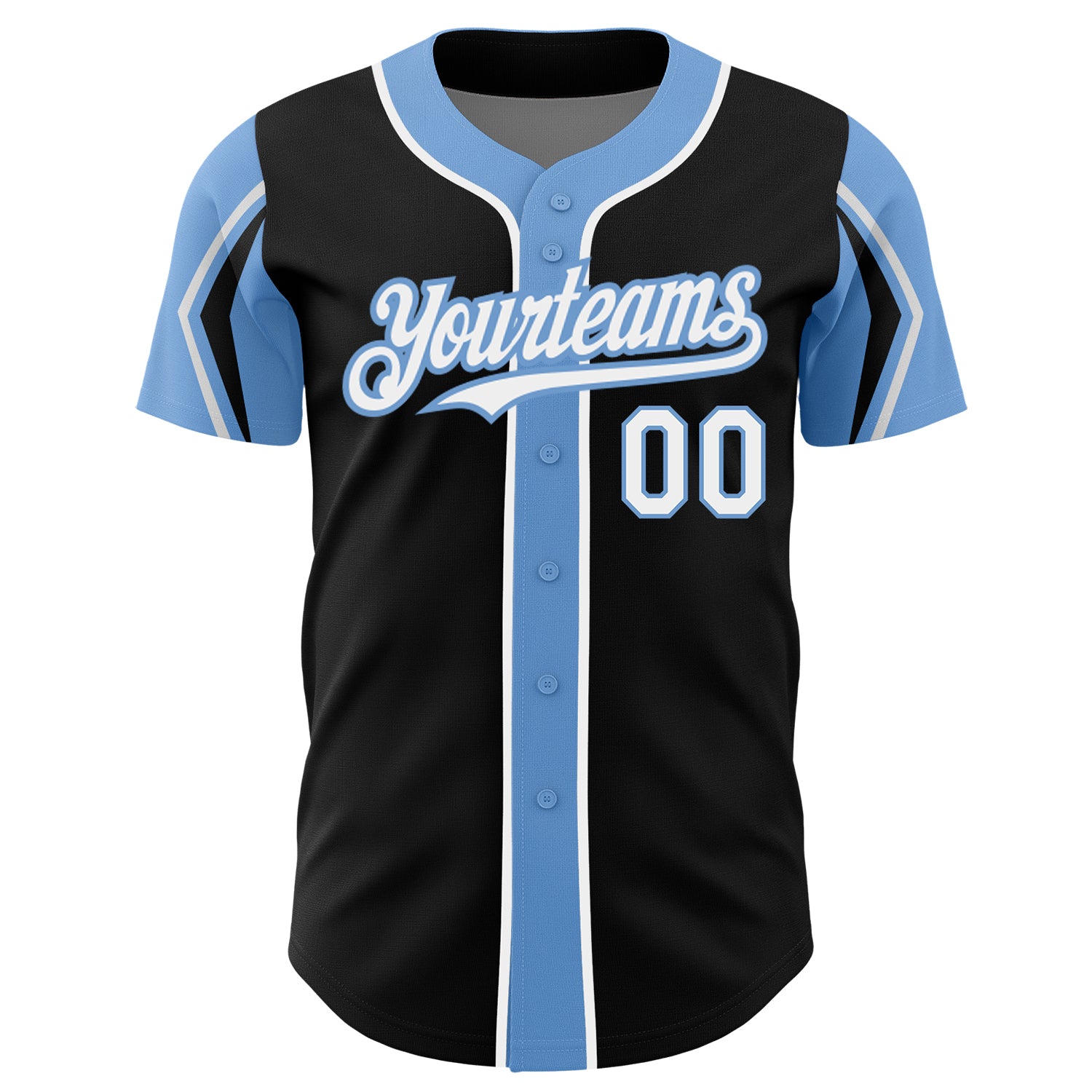 Customizable Baseball Jersey – Black, White, Light Blue – Personalized Team Name & Number – Authentic Arm Shapes Personalized