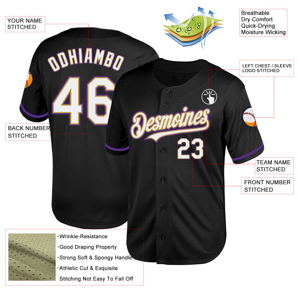 Personalized Black White Old Gold-Purple Mesh Throwback Baseball Jersey