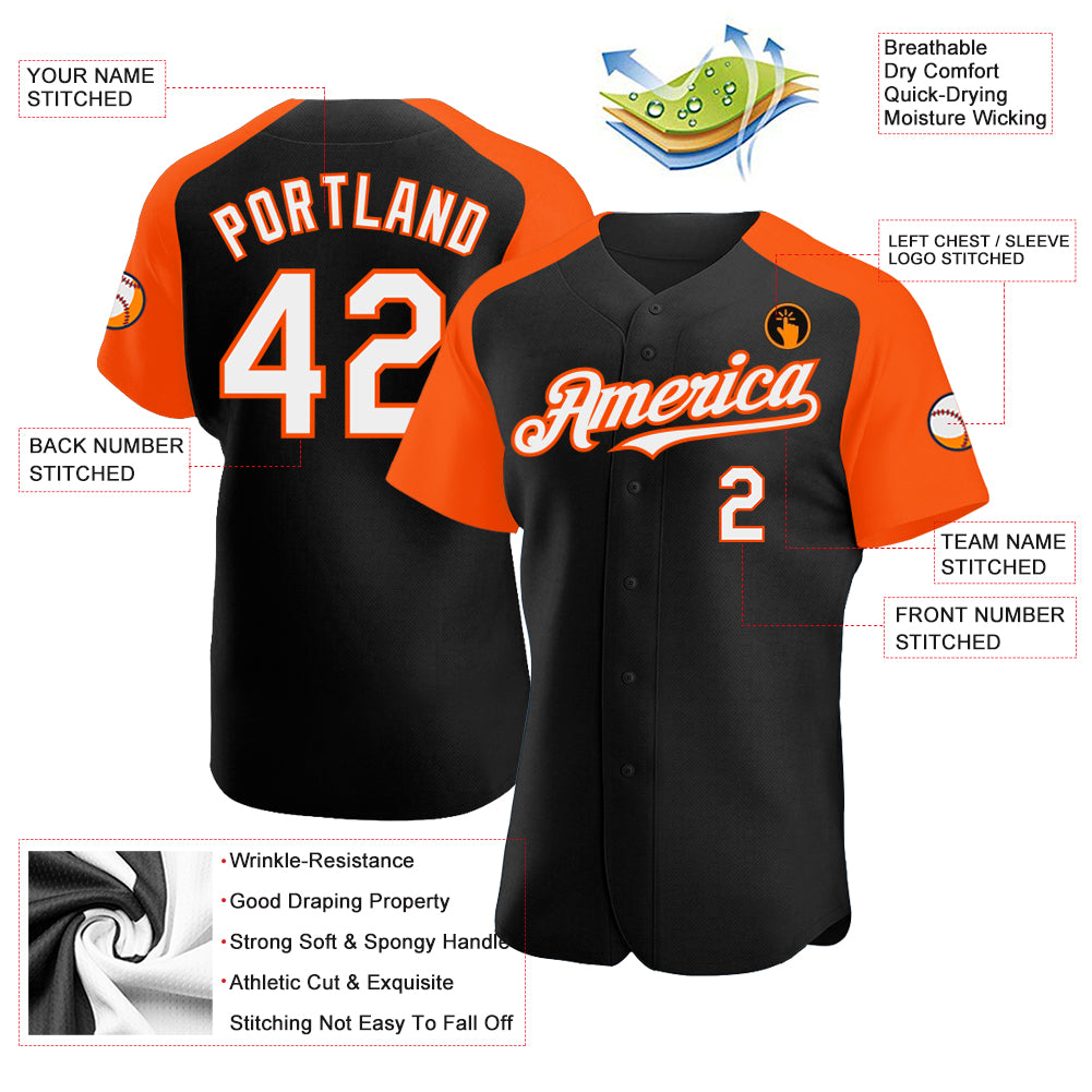 Personalized Custom Name and Number Baseball Jersey | Black White-Orange Authentic Raglan Sleeves Personalized Black White-Orange