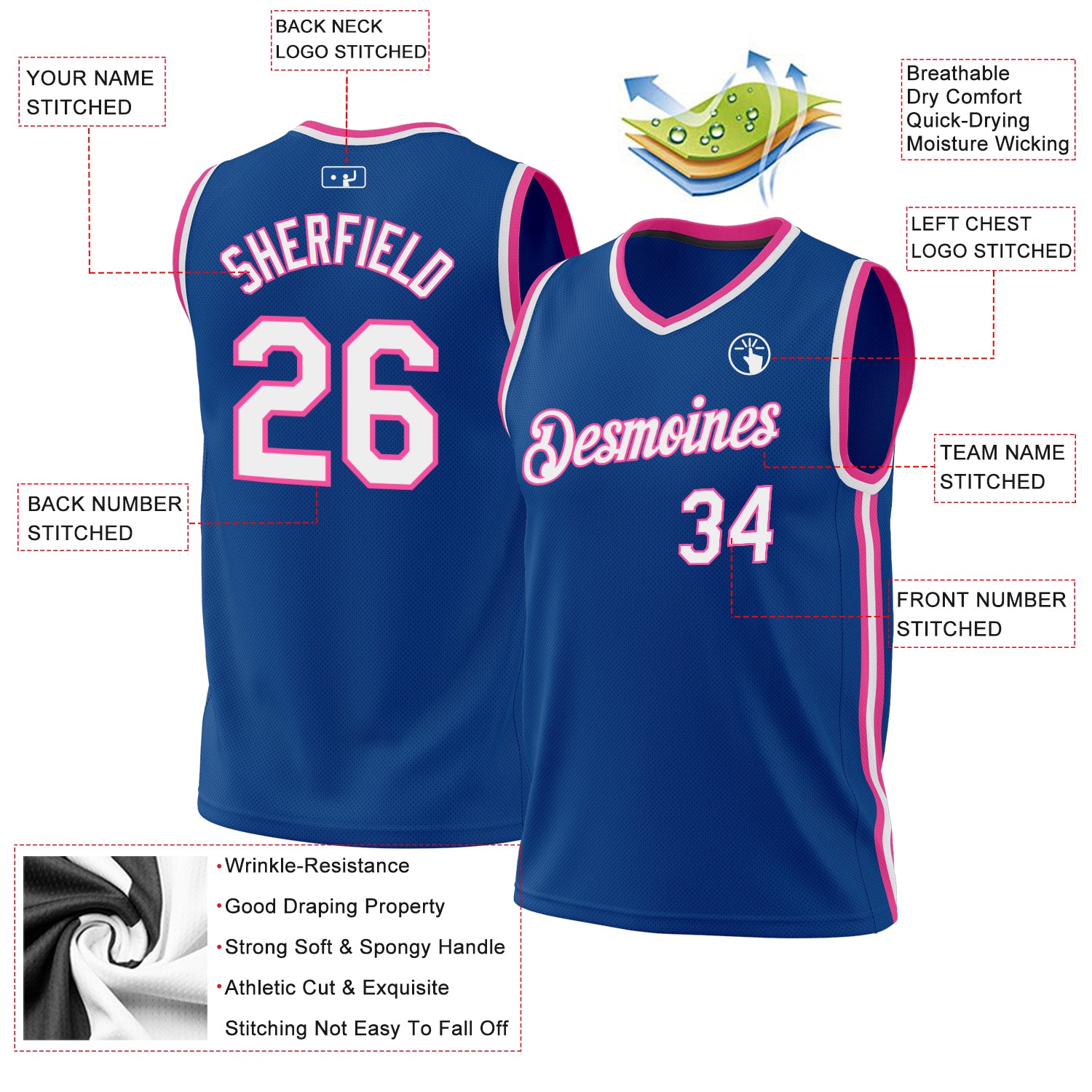 Custom Basketball Jersey with Personalized Name and Number – Blue White Pink Authentic Throwback Style Personalized Blue
