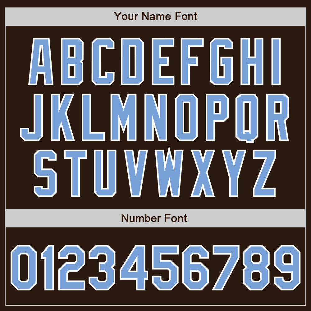 Personalized Varsity Letterman Jacket in Brown Light Blue White, Full-Snap Bomber Style Personalized Brown Light Blue-White