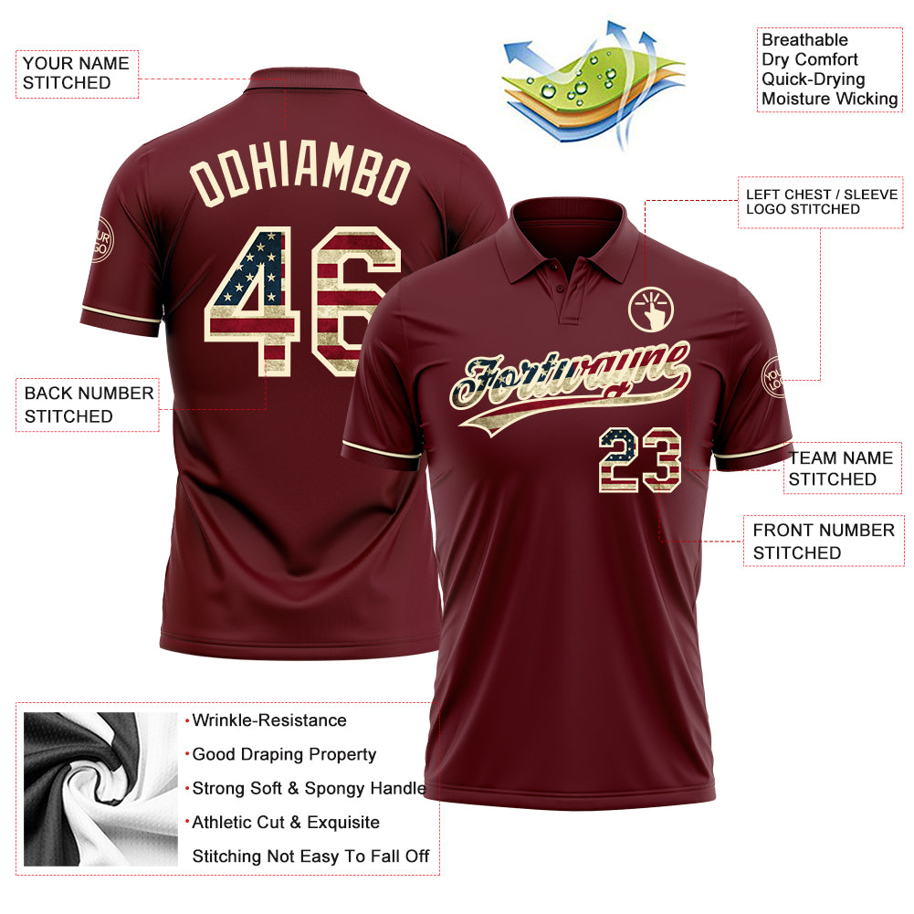 Personalized Vintage USA Flag Burgundy Cream Performance Golf Polo Shirt Personalized Burgundy Vintage USA Flag-Cream Performance