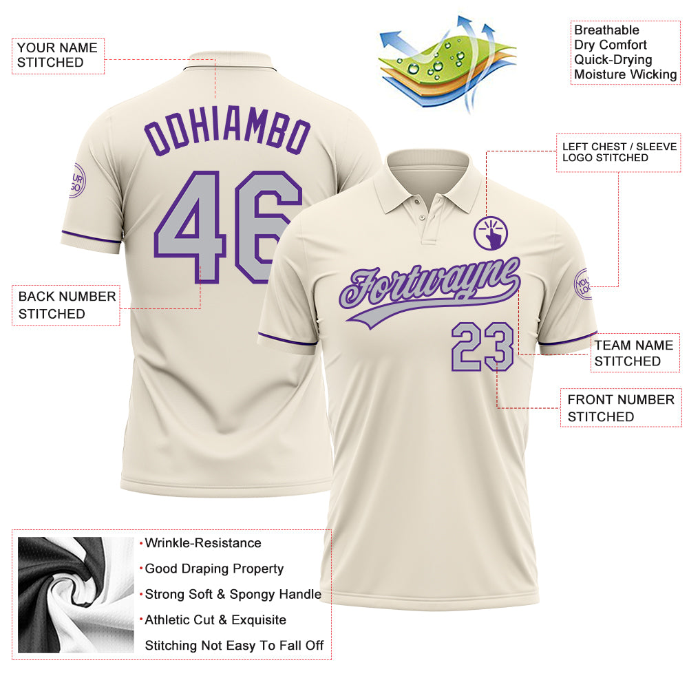 Custom Team Name Number Cream Gray Purple Vapor Golf Polo Shirt Performance Personalized Cream Gray-Purple Performance Vapor