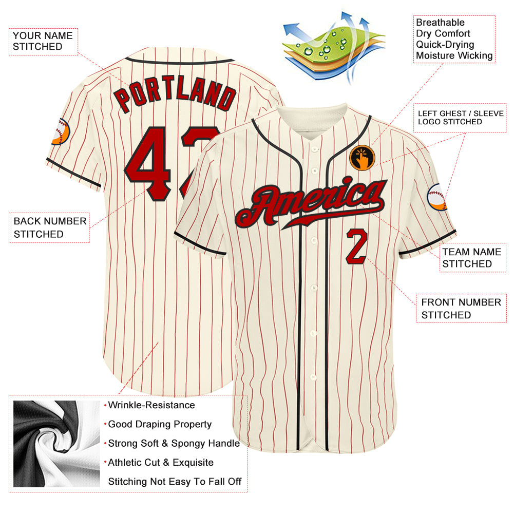 Personalized Red and Black Pinstripe Baseball Jersey – Custom Cream Jersey Personalized Cream Red Pinstripe Red-Black Baseball