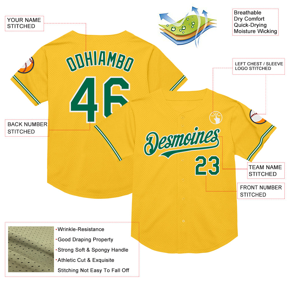 Personalized Gold Kelly Green-White Mesh Authentic Throwback Baseball Jersey Team Custom Name and Number