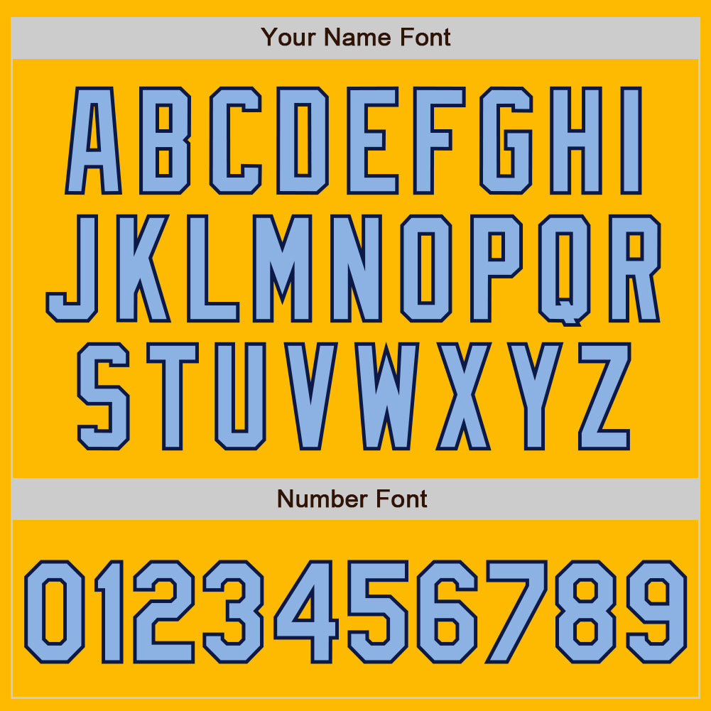 Custom Name and Number Personalized Baseball Jersey in Gold Light Blue-Navy, Authentic Team Colors and Arm Shapes Personalized