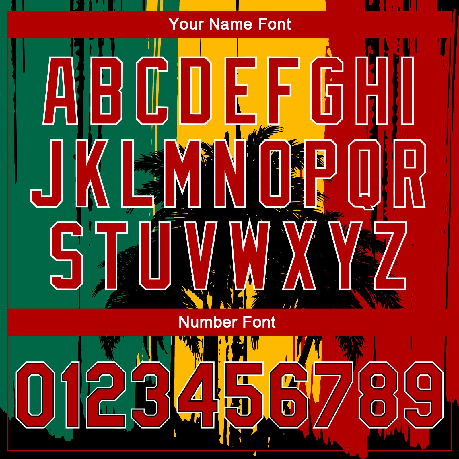 Personalized Gold Red Black-Kelly Green Black History Month Hawaii Palm Trees 3D Pattern Design Bomber Full-Snap Varsity Letterman Jacket Team Custom Name and Number