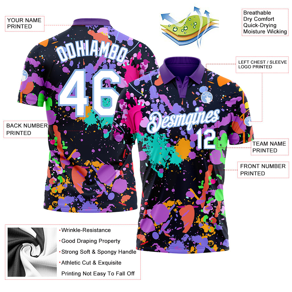 Personalized Graffiti Pattern White-Light Blue 3D Splashes Performance Golf Polo Shirt Team Custom Name and Number