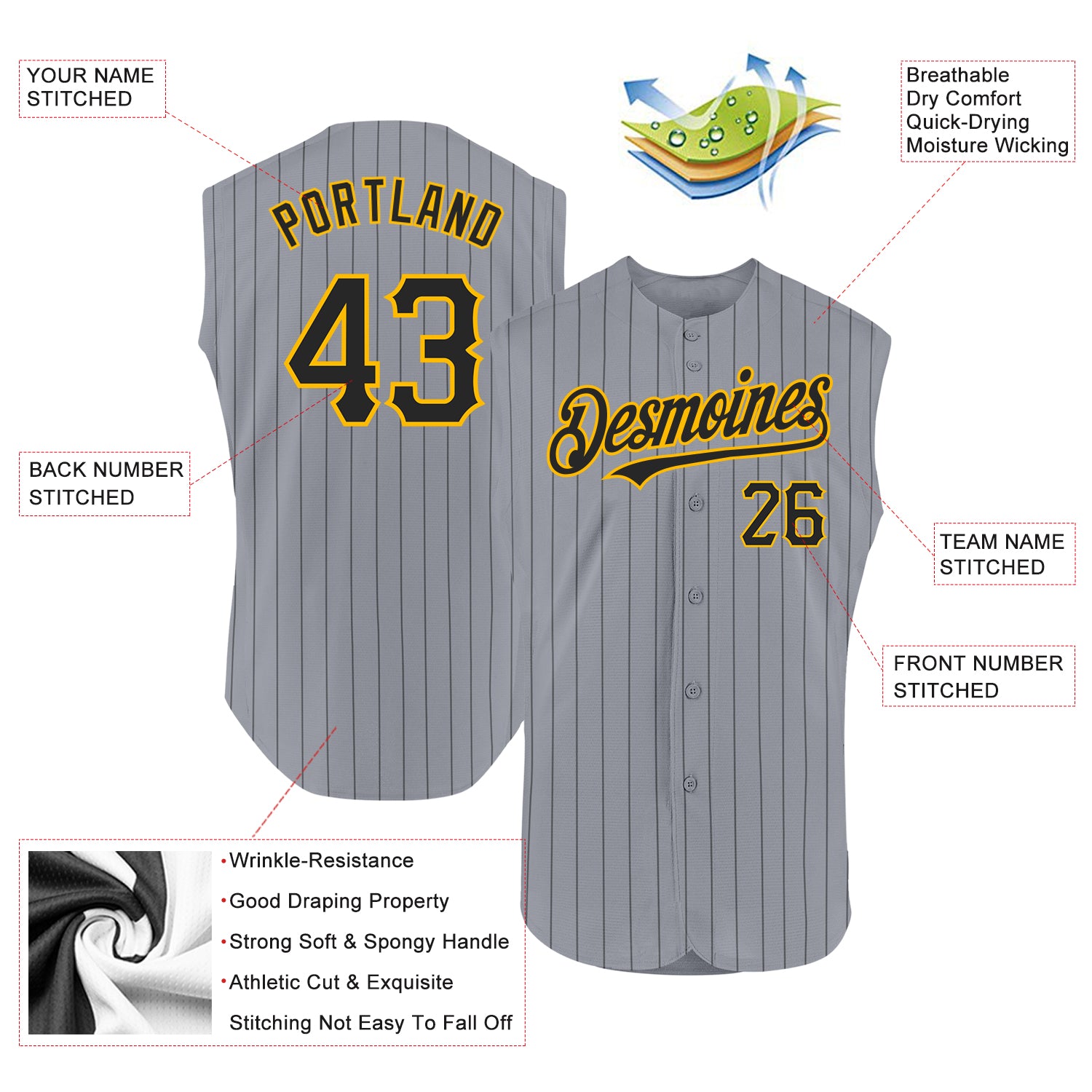 Custom Personalized Baseball Jersey – Gray Black Pinstripe Gold – Sleeveless with Name & Number Personalized Gray Black Pinstripe