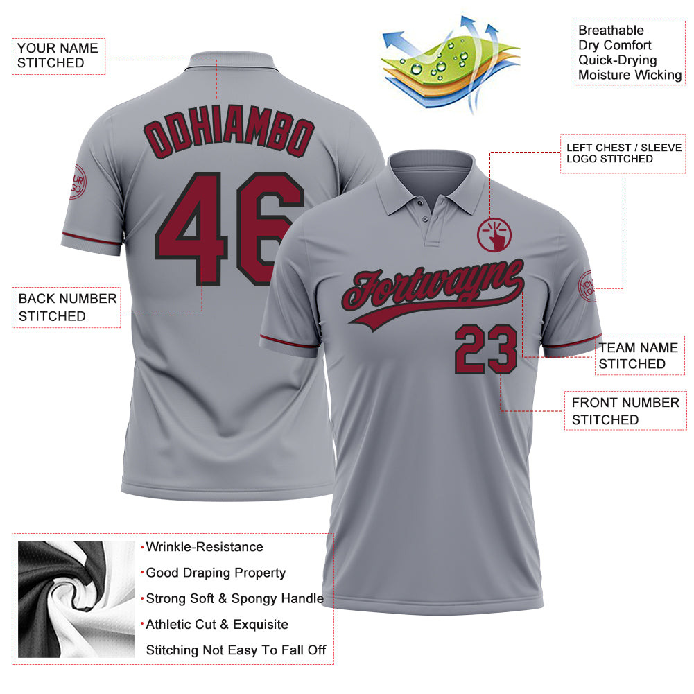 Custom Name Number Golf Polo Shirt – Personalized Gray Crimson-Black Performance Personalized Gray Crimson-Black Performance