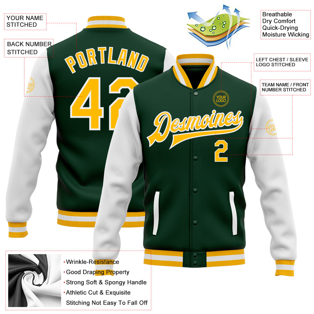 Custom Team Name Number Green Gold-White Bomber Varsity Letterman Full-Snap Two Tone Jacket Personalized Green Gold-White