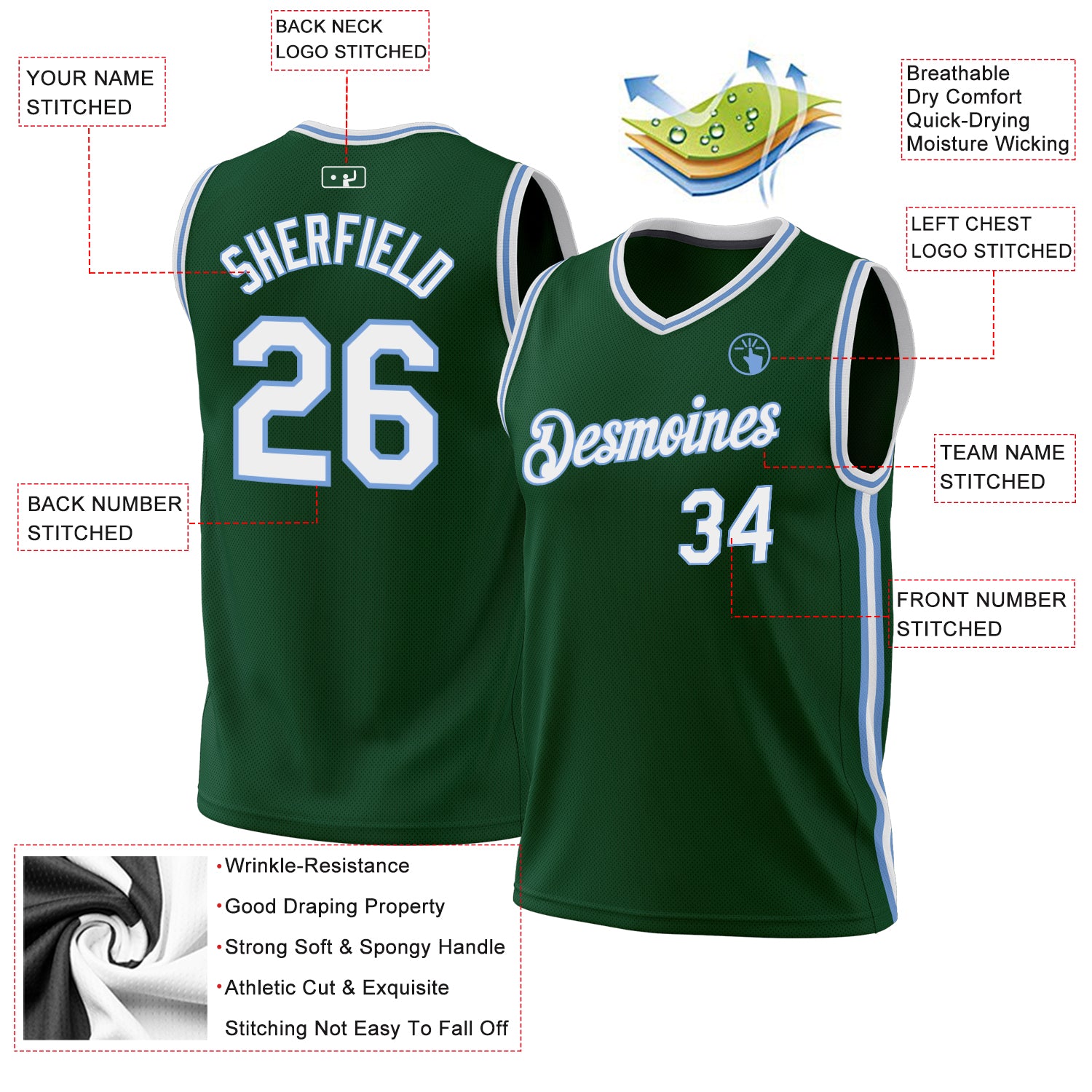 Personalized Hunter Green White-Light Blue Basketball Jersey – Authentic Throwback Jersey Personalized Hunter Green White-Light