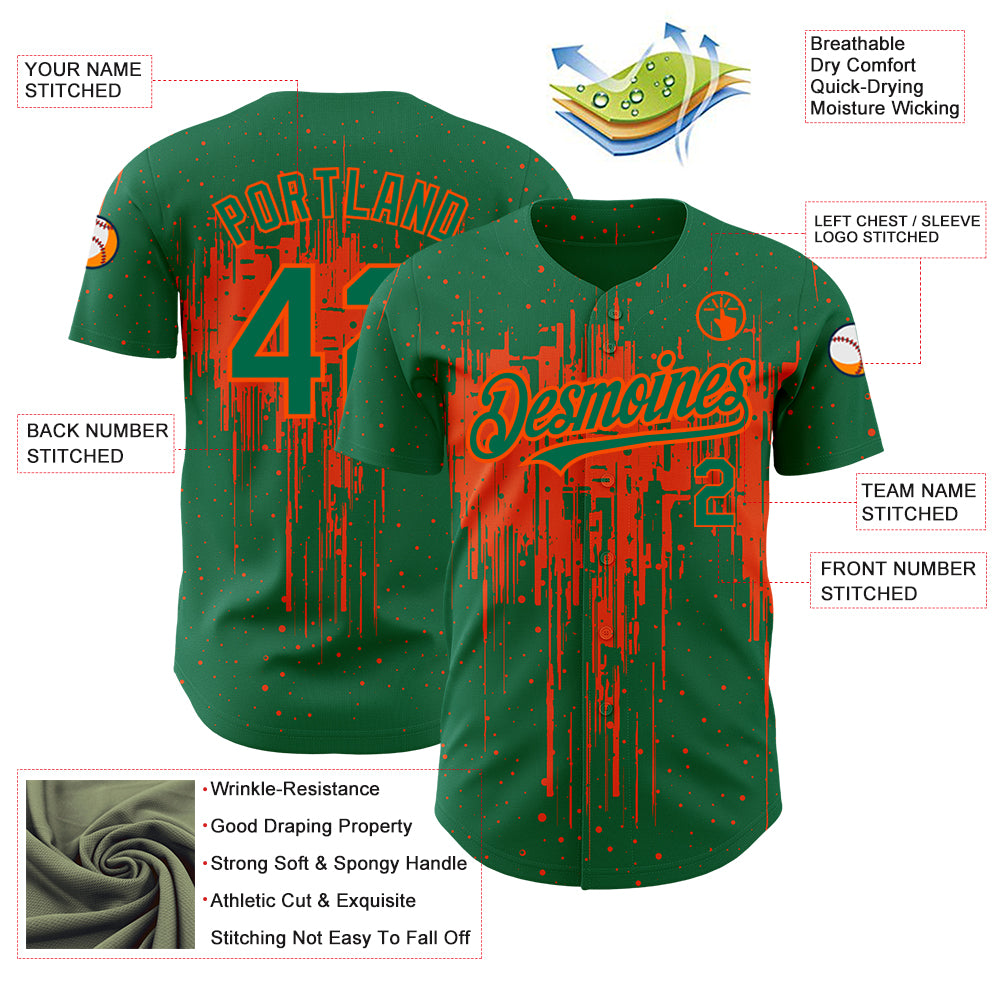 Custom 3D Dripping Splatter Art Baseball Jersey with Personalized Name & Number – Kelly Green & Orange Design Personalized