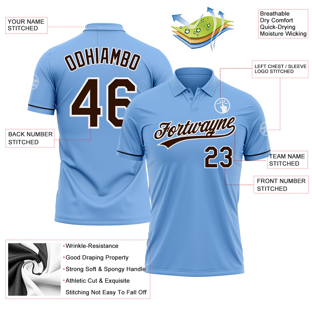 Custom Team Name Number Light Blue Brown-White Performance Golf Polo Shirt Personalized Light Blue Brown-White Performance