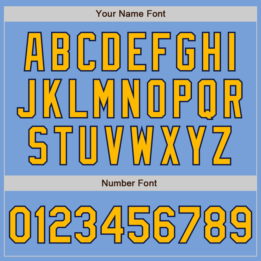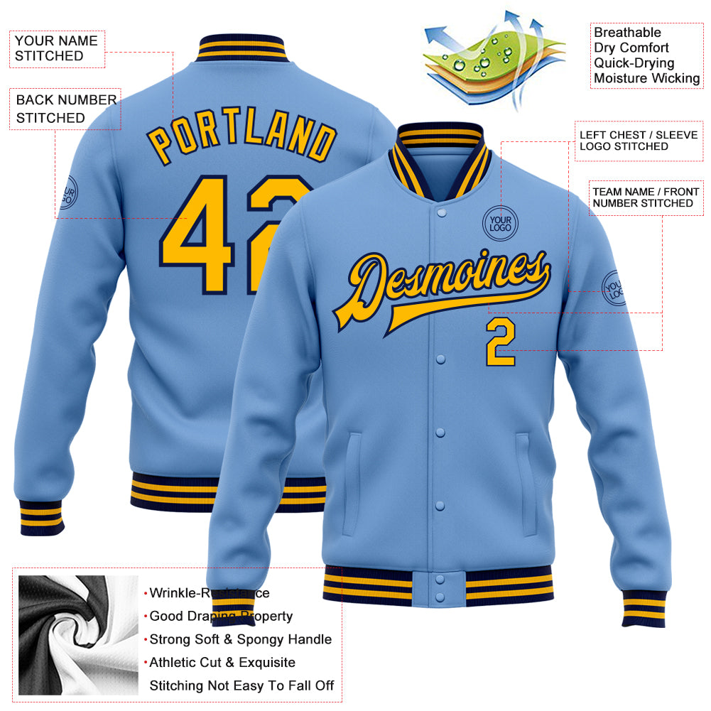 Personalized Light Blue Gold Navy Varsity Letterman Bomber Jacket Full-Snap Personalized Light Blue Gold-Navy Bomber Full-Snap