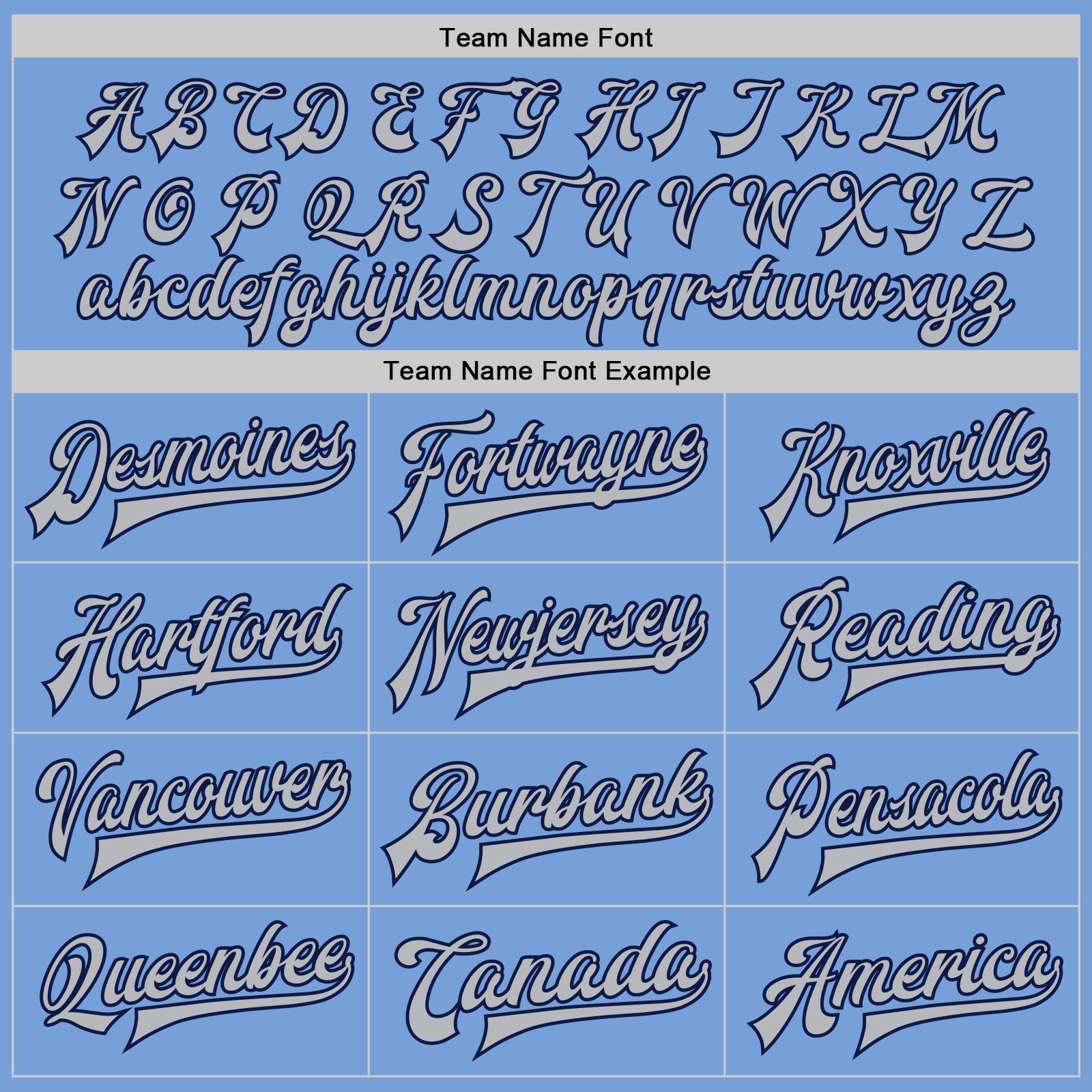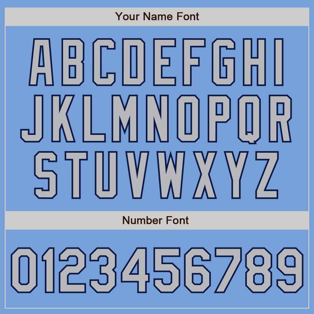 Custom Team Name Number Light Blue Gray-Navy Varsity Letterman Bomber Jacket Full-Snap Two Tone Personalized Light Blue Gray-Navy