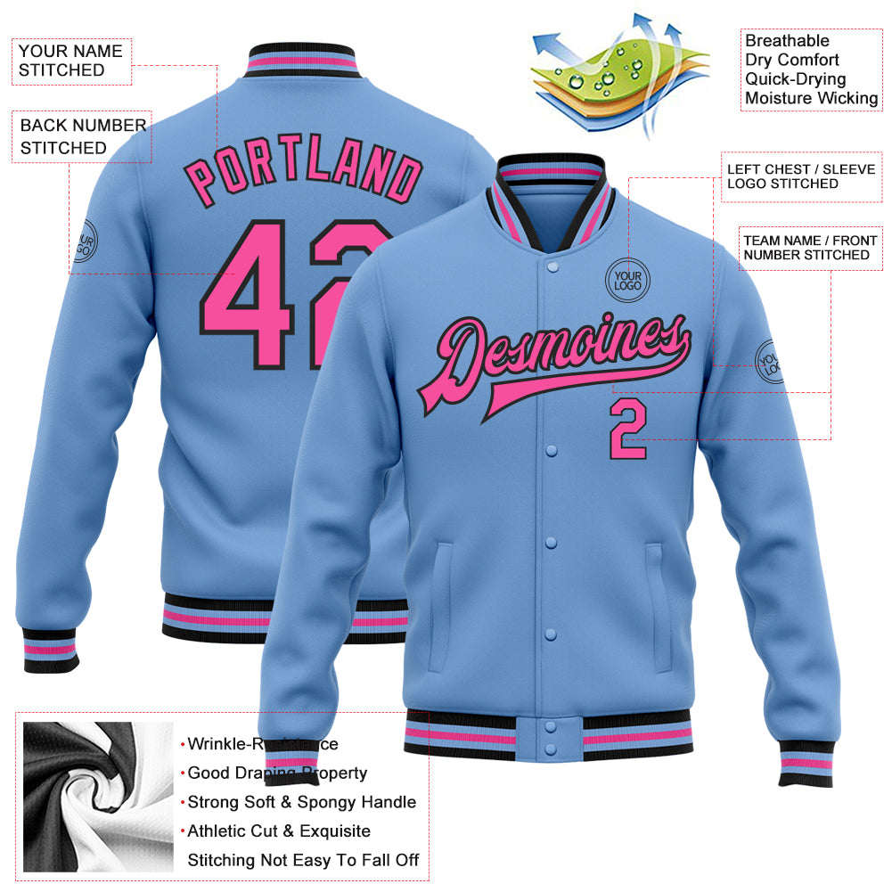 Personalized Light Blue Pink-Black Bomber Full-Snap Varsity Letterman Jacket Team Custom Name and Number