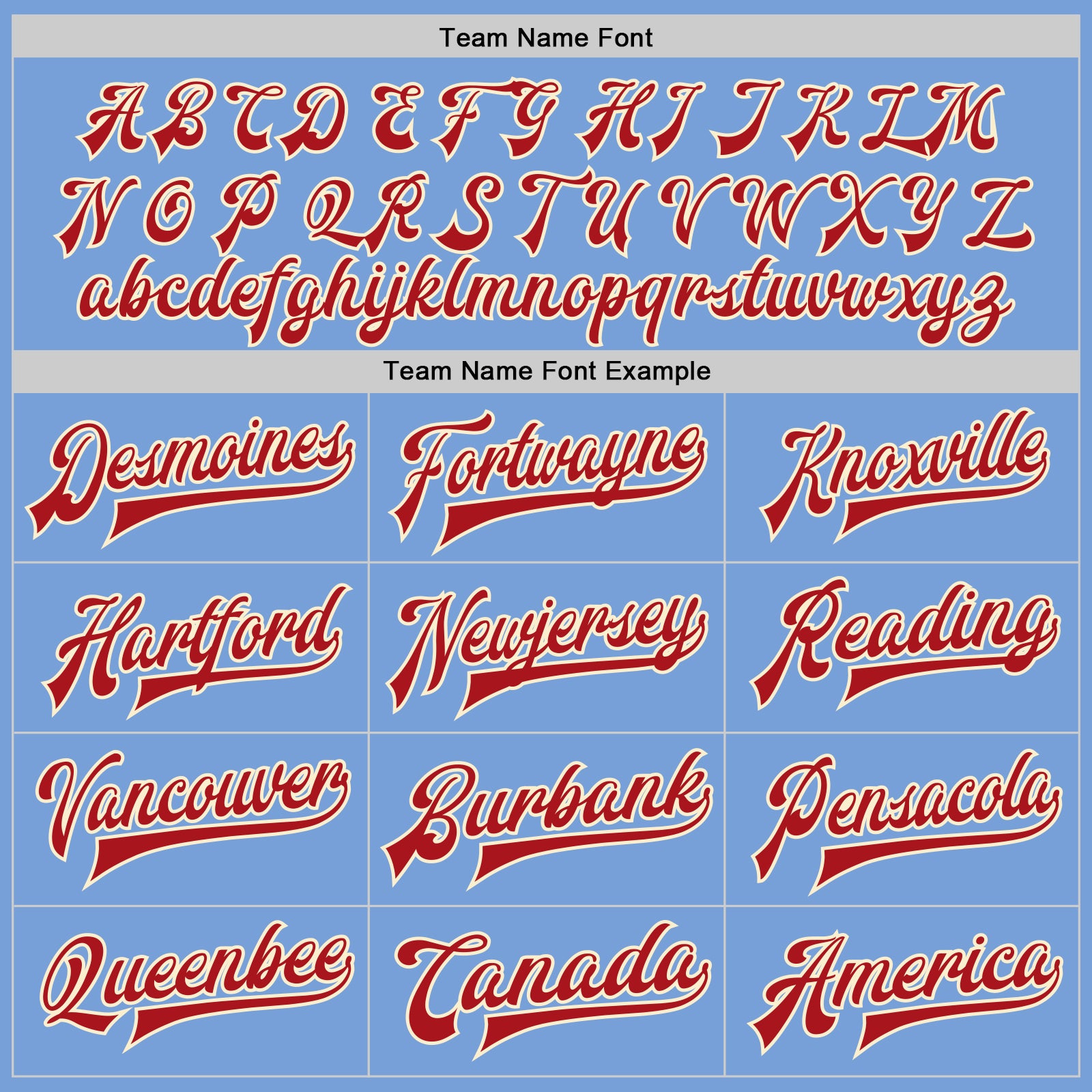 Personalized Light Blue Red-Cream Bomber Full-Snap Varsity Letterman Jacket Team Custom Name and Number