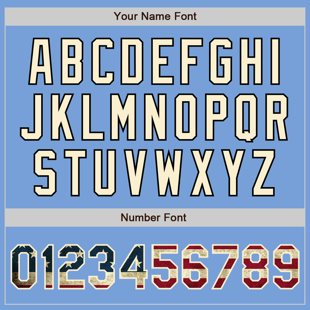 Personalized Light Blue Vintage USA Flag Cream-Black Bomber Full-Snap Varsity Letterman Jacket Team Custom Name and Number