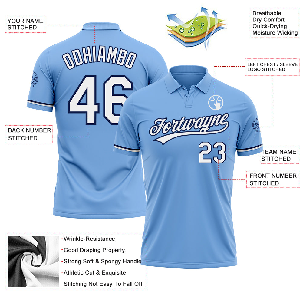 Custom Light Blue White Navy Performance Golf Polo Shirt with Name and Number Personalized Light Blue White-Navy Performance