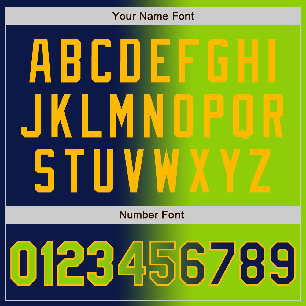 Personalized Navy Neon Green-Gold Bomber Full-Snap Varsity Letterman Gradient Fashion Jacket Team Custom Name and Number