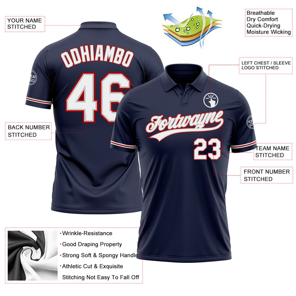 Custom Team Name Number Performance Vapor Golf Polo Shirt – Navy White Gray Red Personalized Navy White Gray-Red Performance