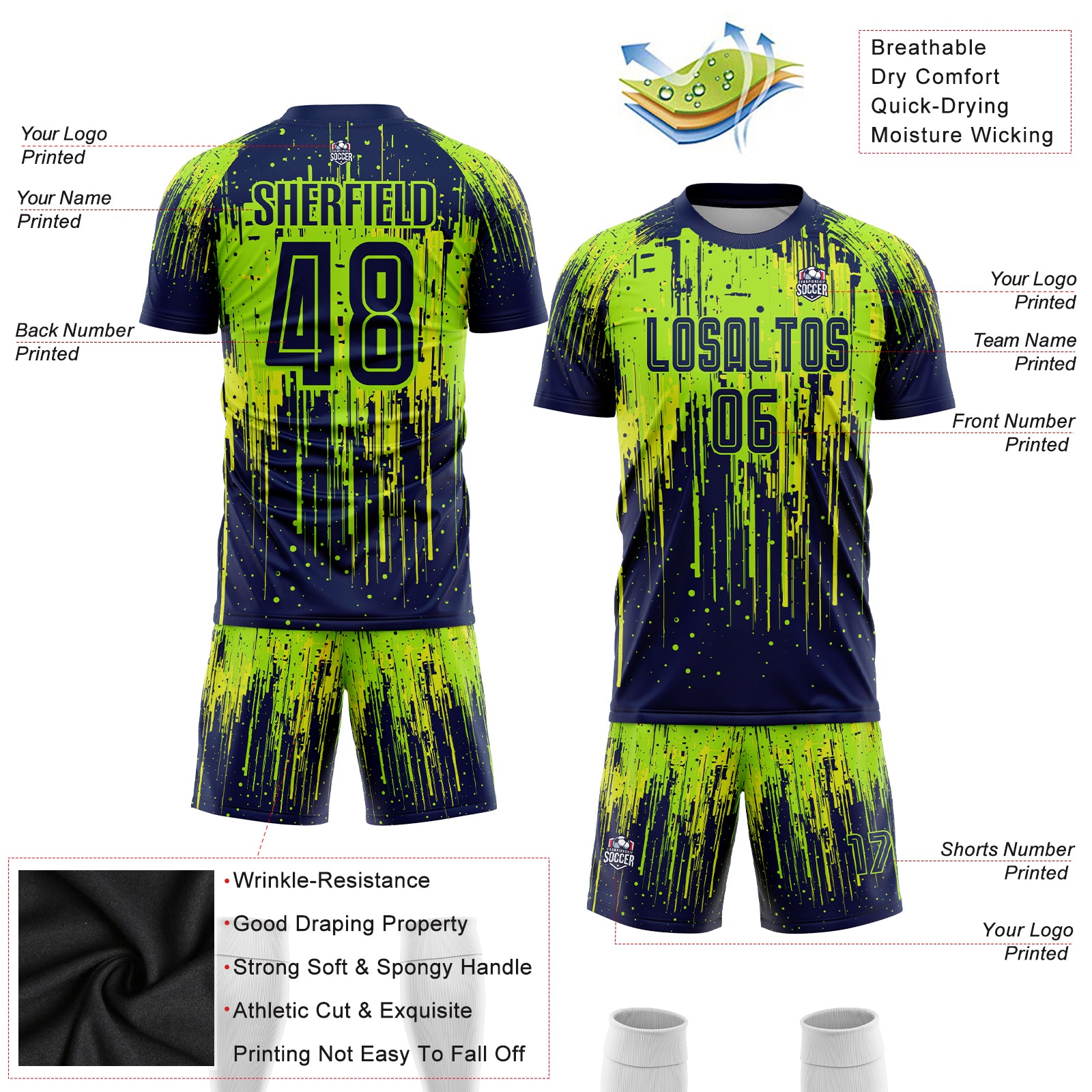 Personalized Neon Green Navy-Neon Yellow Sublimation Soccer Uniform Jersey Team Custom Name and Number