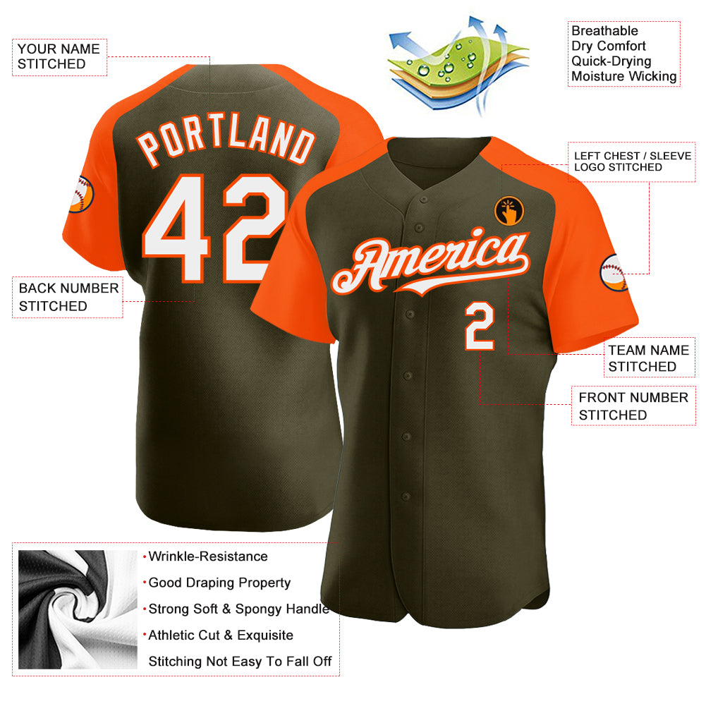 Personalized Olive White-Orange Authentic Raglan Sleeves Salute To Service Baseball Jersey Team Custom Name and Number